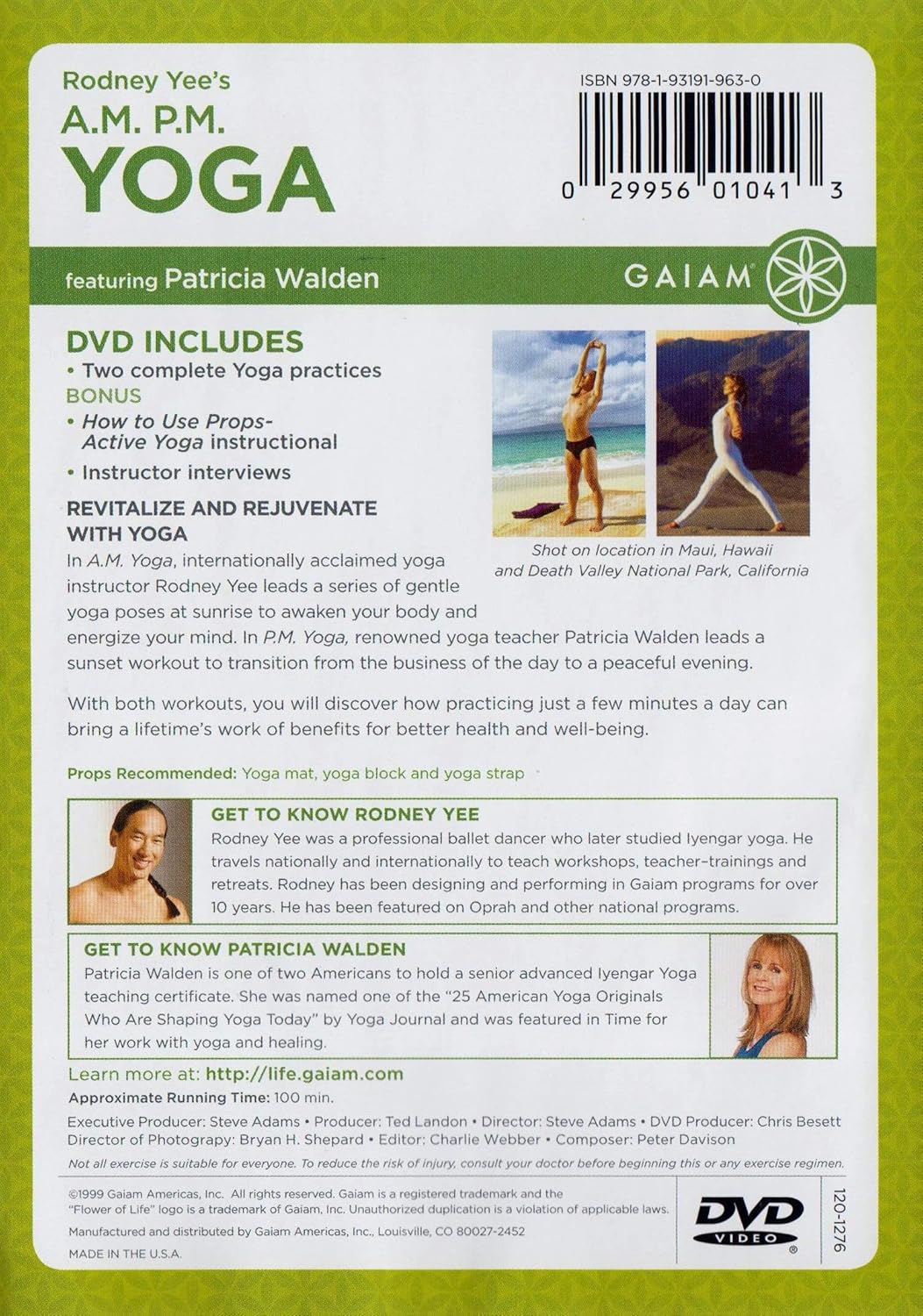 Rodney Yee and Patricia Walden present this twice-a-day yoga workout designed for busy beginners. Rodney Yee presents a daily 15-minute morning workout designed to increase circulation, improve mobility, and bring clarity to your mind, while Patricia Walden leads a 20-minute evening routine designed to quiet the mind after the stress of the day.
