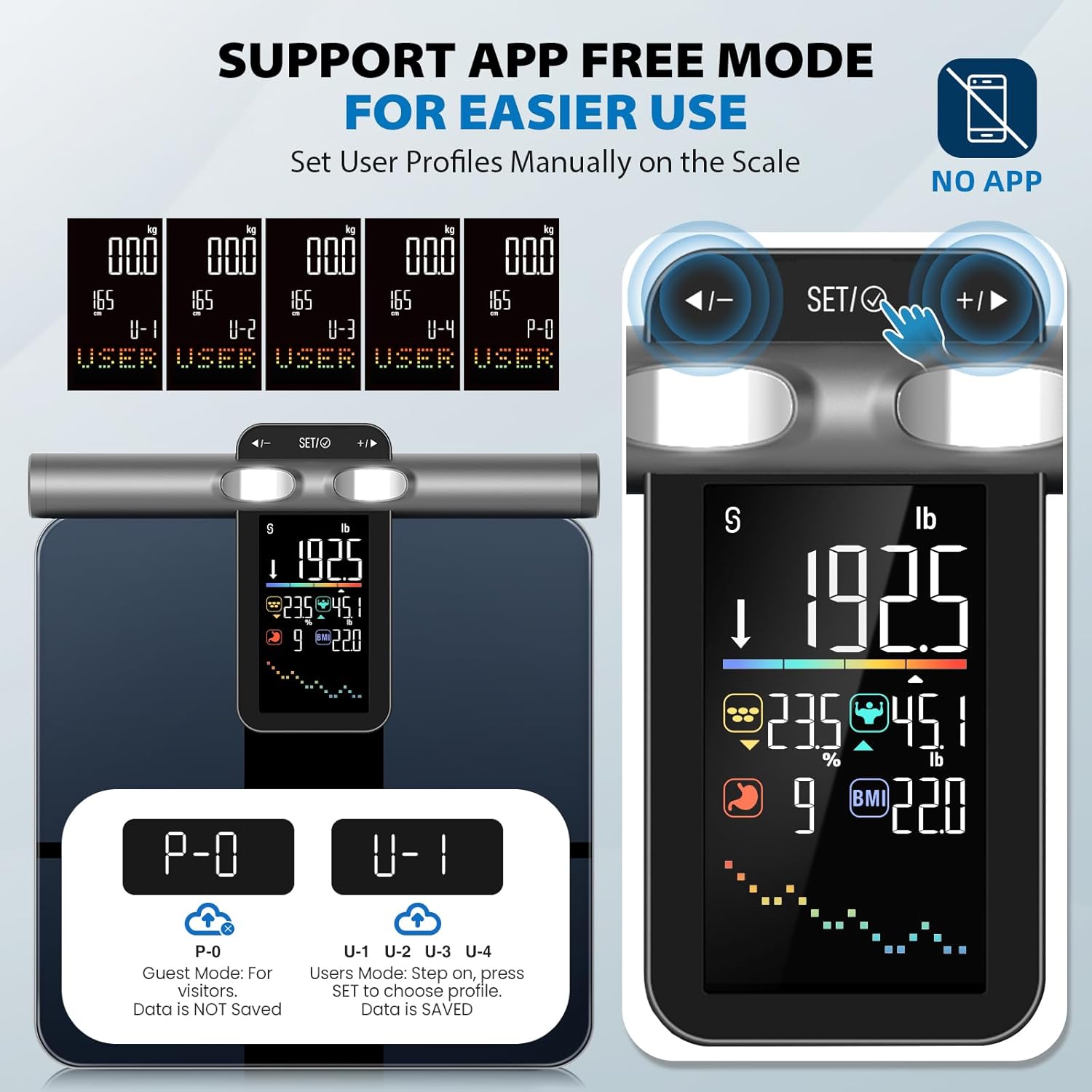 SIMPLE QR CODE SHARING & APP-FREE OPERATION: Our bathroom scale cares for your entire family’s health. Once you’ve created the profile on the APP and finished the first measurement, scan the QR code to share the scale to a second or multiple cell phones to use as sub-accounts. It will intelligently identify users without a phone to protect everyone’s private data. Or set user profiles manually on the scale, then you can use the scale even without an app.
