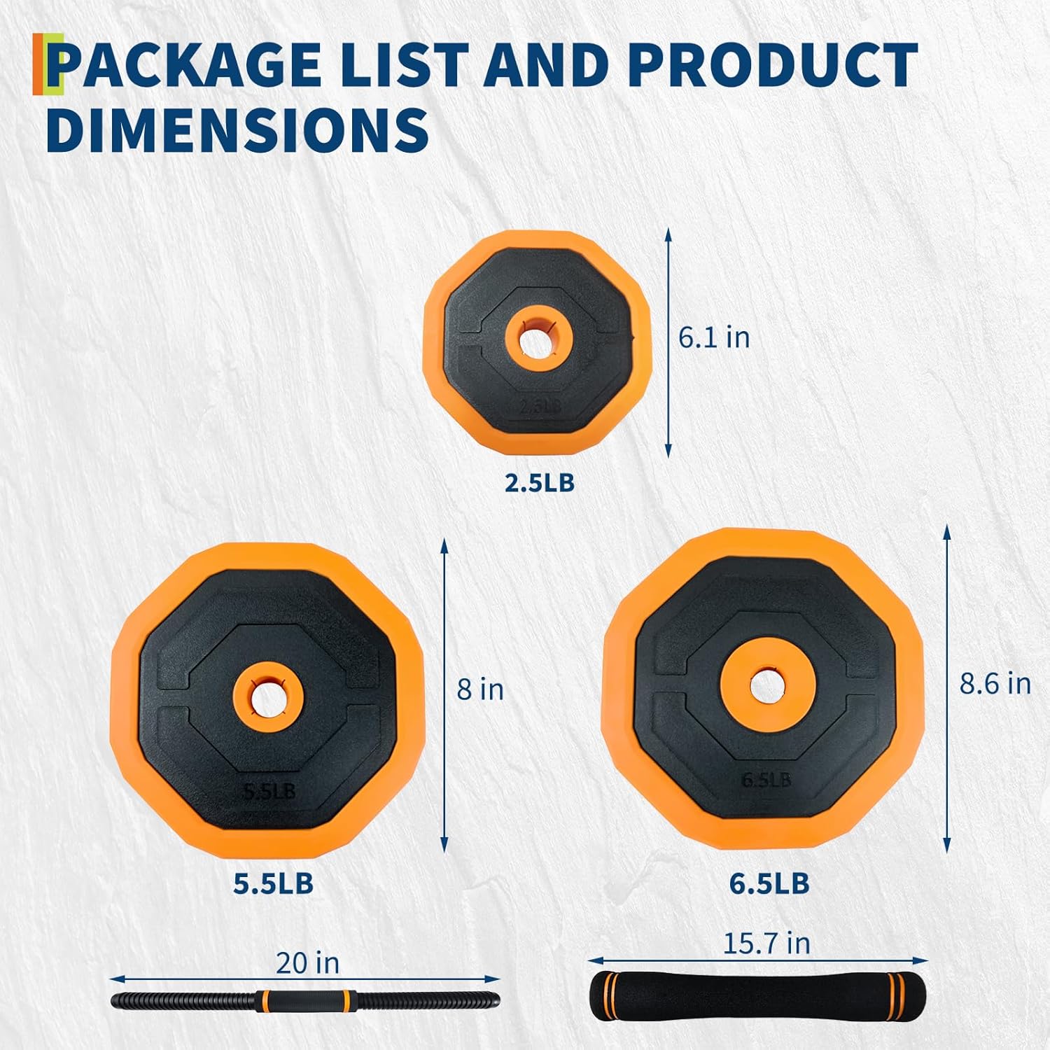 2.5 lbs *4,3.5 lbs*4,4.5 lbs*4,5.5 lbs*4, Fixed Nut*8,Dumbbell Bar*2, Foam Connector*1,Kettle Rod*1, Push-up Stand*2