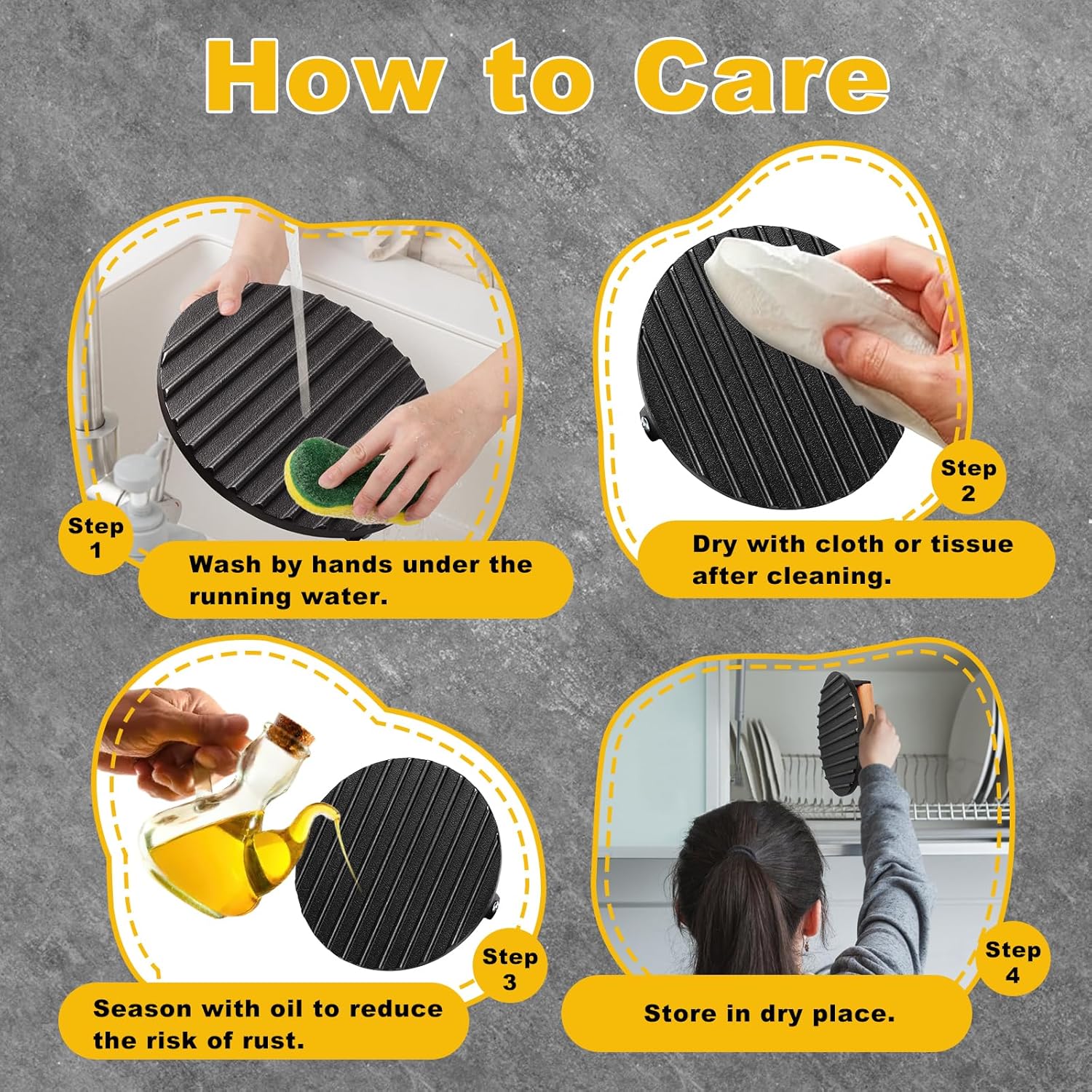 CARE INSTRUCTIONS: Cast iron cookware is an investment that can last a lifetime if taken care of properly. It’s necessary to apply a thin layer of vegetable oil or melted shortening all over the surface of the burger smasher. To extend this griddle accessories’ lifespan, make sure to get into all the nooks and crannies