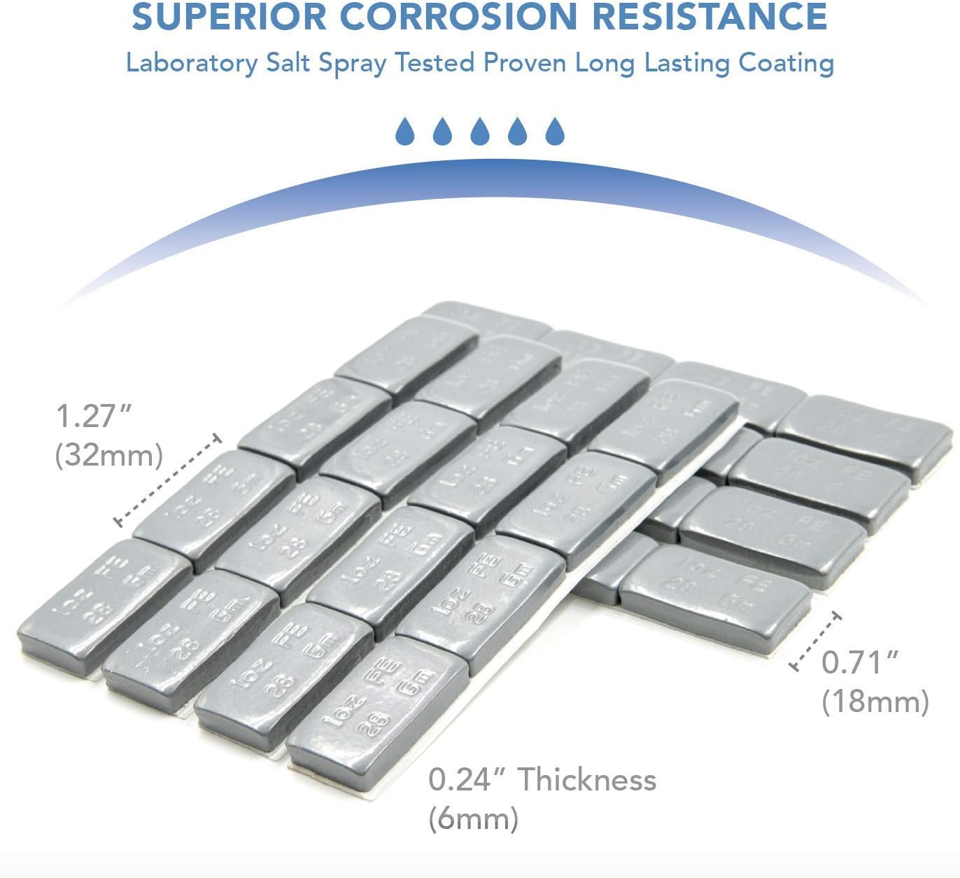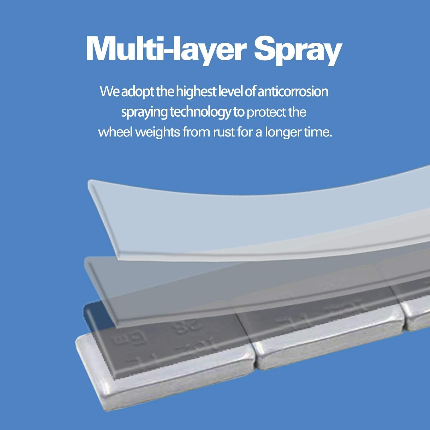 Anti-Corrosion – The surface layer of the wheel weights is first electro-galvanized, then subjected to a multilayer and omni-dimensional plastic spraying process.