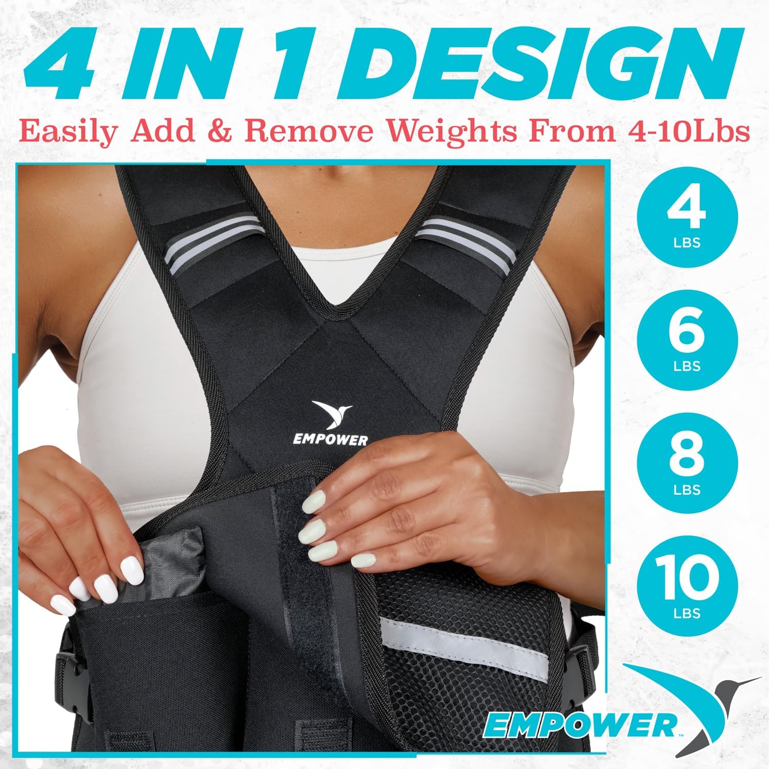 Adjustable Resistance for Every Fitness Level Adjustable weight from 4lbs to 10lbs for the perfect level of resistance for you. Built from soft, flexible neoprene, our weighted vests feature padded shoulders, reflective safety strips, and adjustable side straps for ultimate comfort.
