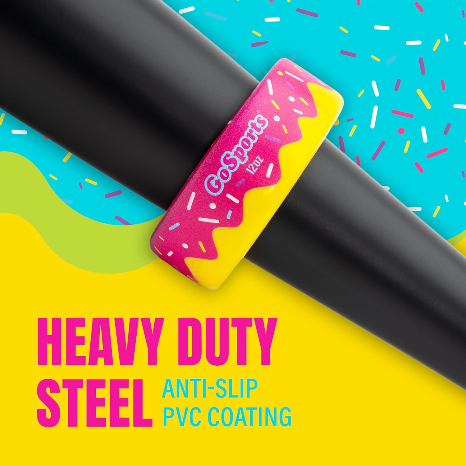 Show off your baseball drip wtih GoSports Baseball and Softball Bat Donuts! These fun bat weights are essential training aids for any player. Use the bat weights to make your bat heavier and help improve your swing speed, strength, and overall batting performance. Our value pack includes two weights, one 16 oz and one 12 oz, so you can change up and customize your weight training. Always consult with a certified coach before use. Each weight is constructed from heavy-duty steel and features a non-slip coating that protects your bat from damage. These bat weight rings are compatible with most standard size bats, so they are great for both kids and adults. Maximize practice sessions with GoSports Baseball and Softball Bat Donuts!