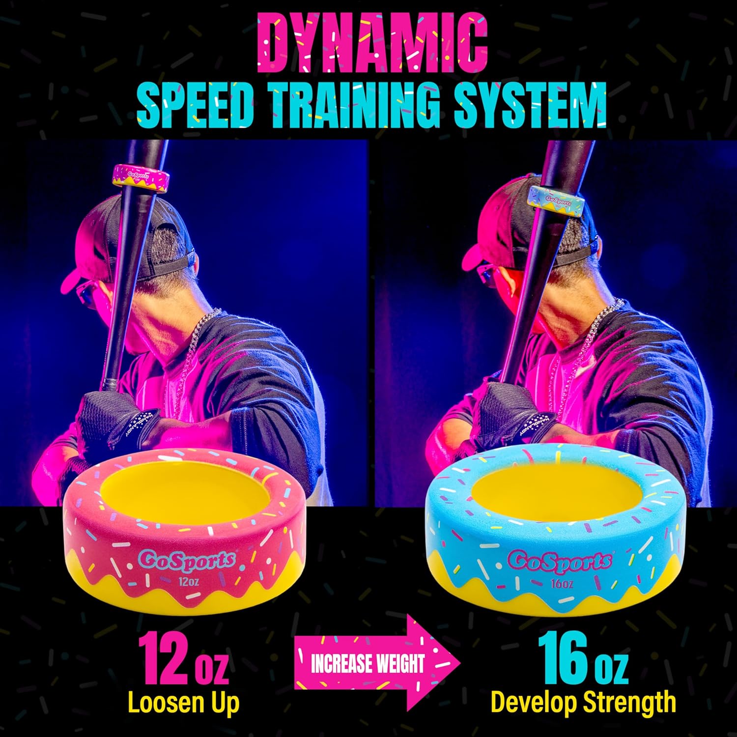 DYNAMIC SPEED TRAINING: Includes one 12 oz and one 16 oz batting donut for a comprehensive training system; Start light to loosen up, go heavier to build strength, then remove weight to swing with improved power