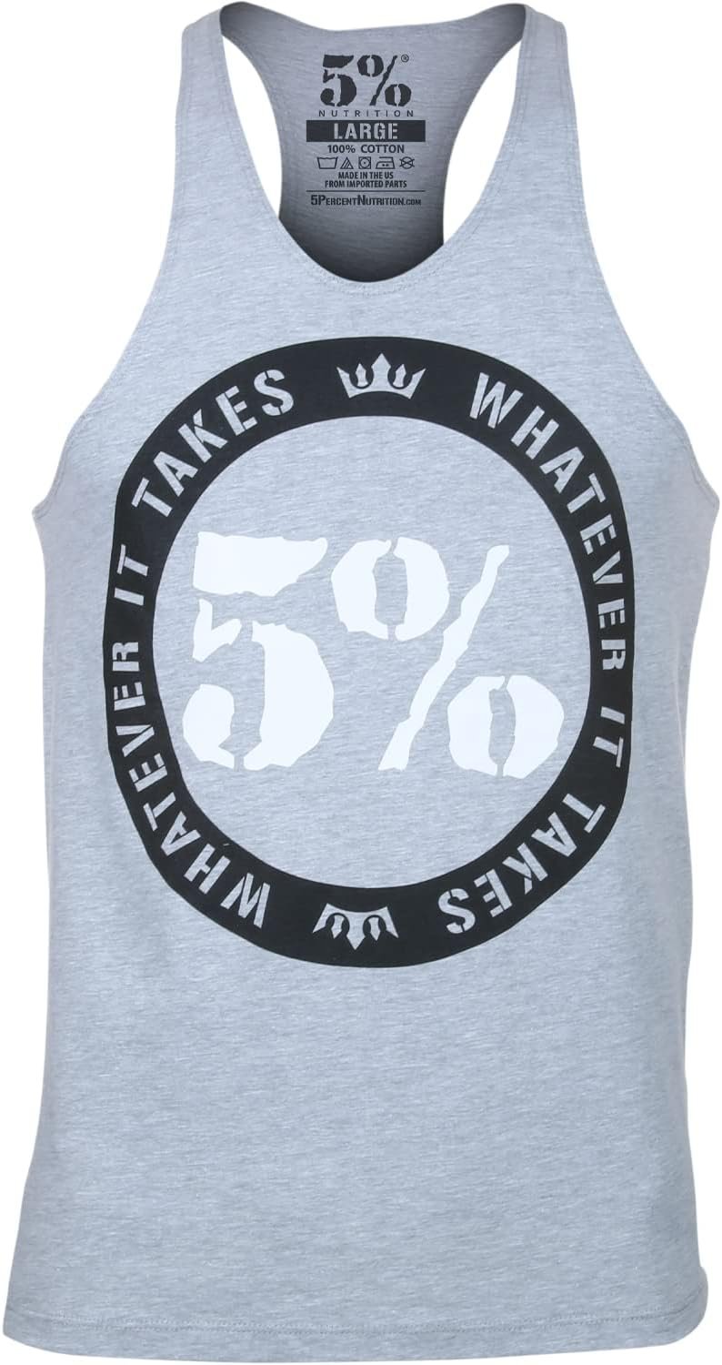 Summer is here and so are new stringer tank tops! Catch a breeze, show off that body and turn some heads in these brand new beauties. Gray Stringer Tank with a circular “Whatever It Takes” logo and white 5% in the middle, and a black 5% on the top back/neck 100% Cotton Machine wash cold Hang dry Design #280